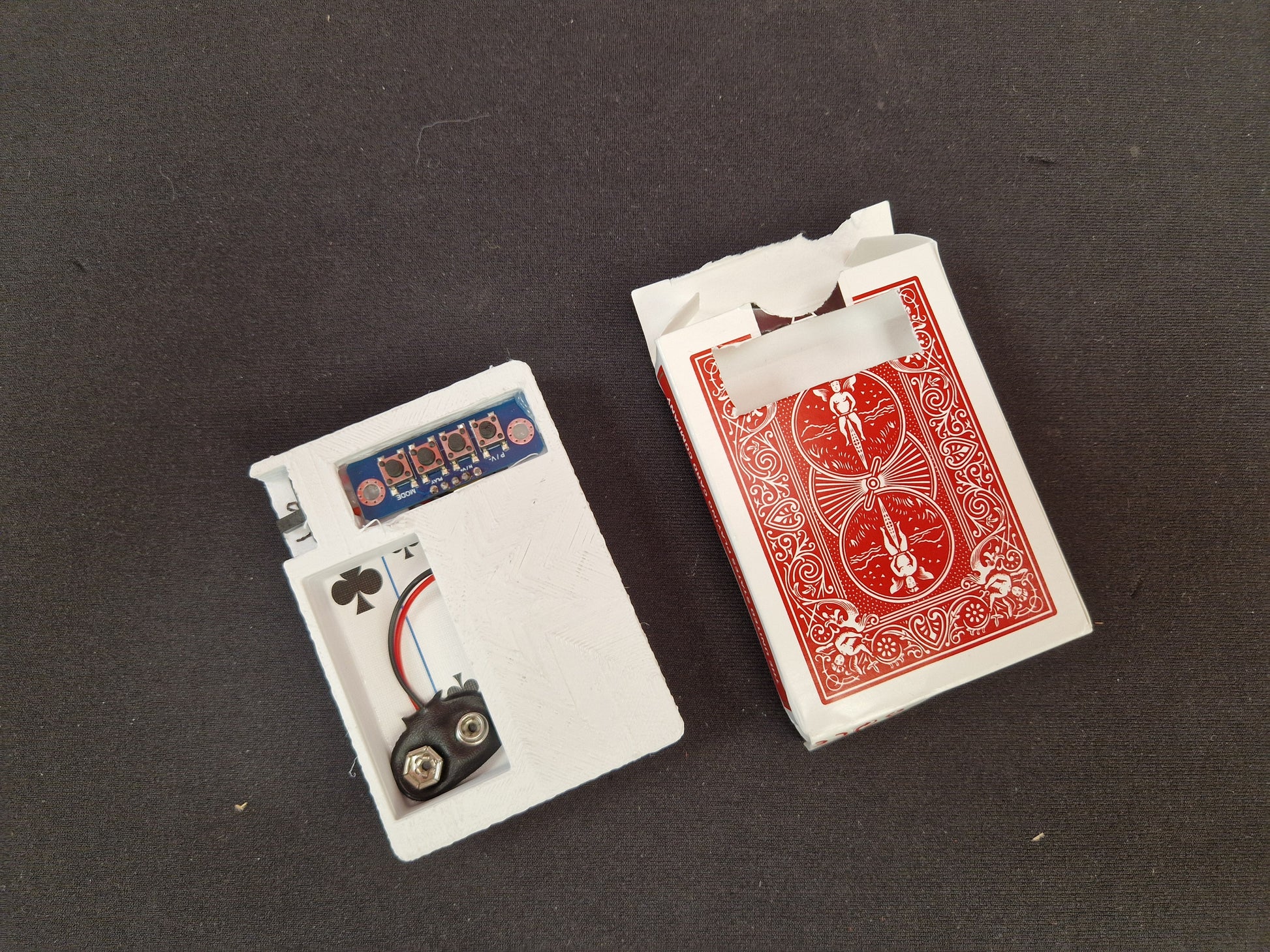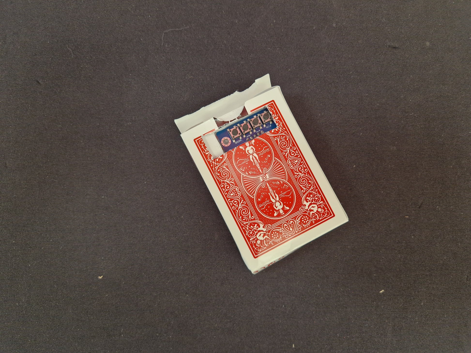 - Four button remote, pre programmed with separate functions made to fit inside a card box