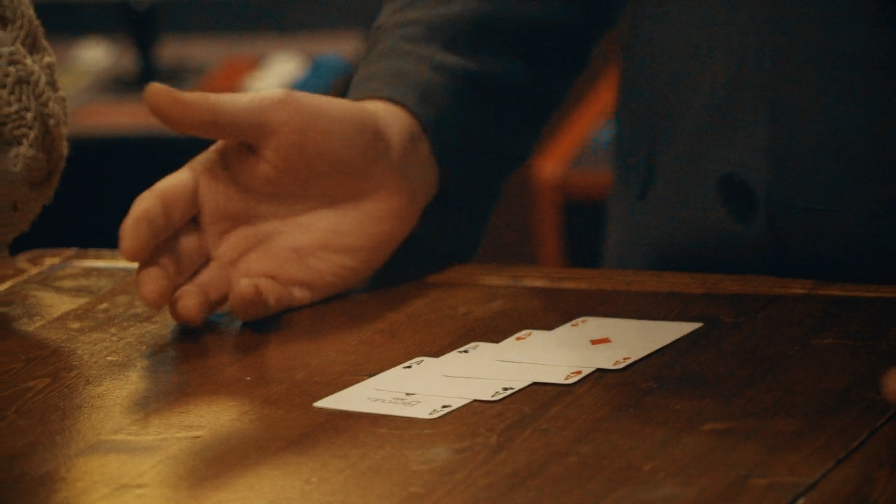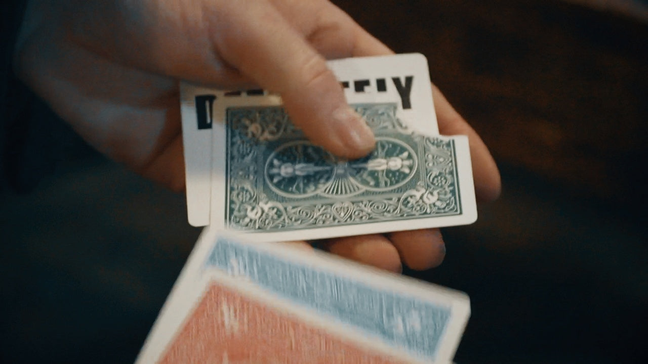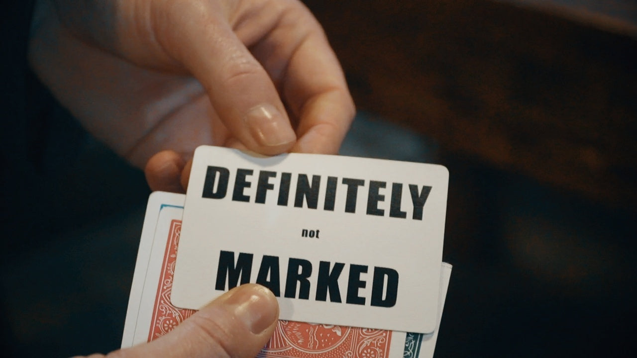 In this well-structured routine the performer removes the four aces from a red deck while describing a special type of marking system where you could rub lipstick on the back of the cards to secretly tell what they are. In showing the cards, one of them magically turns pink. Next the performer describes how you can also use the ink in your blue jeans to mark the cards, and now the back of one of the cards has transformed into a blue card. Now a tactile system of marking called nail nicking is demonstrated and the third card has not only turned green but is missing a huge corner. For the finale, the magician proves the last card is definitely not marked by showing it has transformed from a red bicycle backed card to one with boldly printed letters that say, “Definitely Not Marked.” The best part is that at the end you can let your audience examine the cards.
