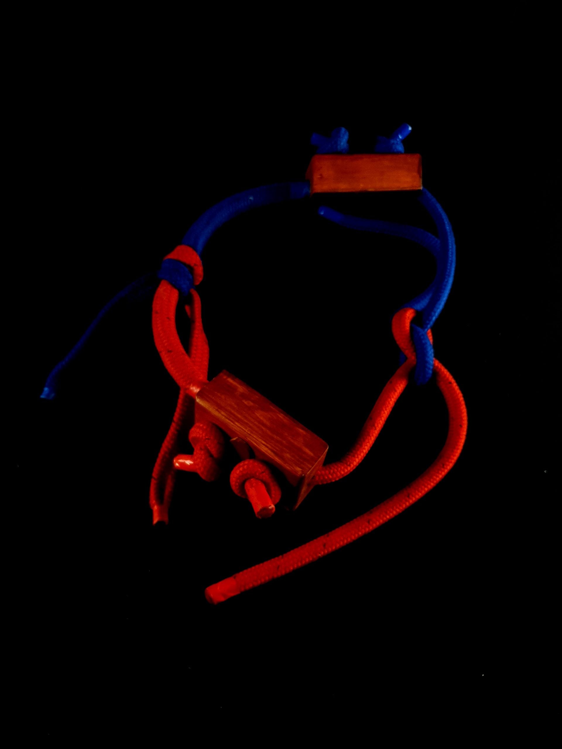 The magician invites three children up to help. Two wooden blocks are shown with rope attached to each block. The wooden blocks have all holes in them which are shown to go all the way through each block. The pieces of rope are then shown, tied together and then tied around the waist of one of the volunteers.