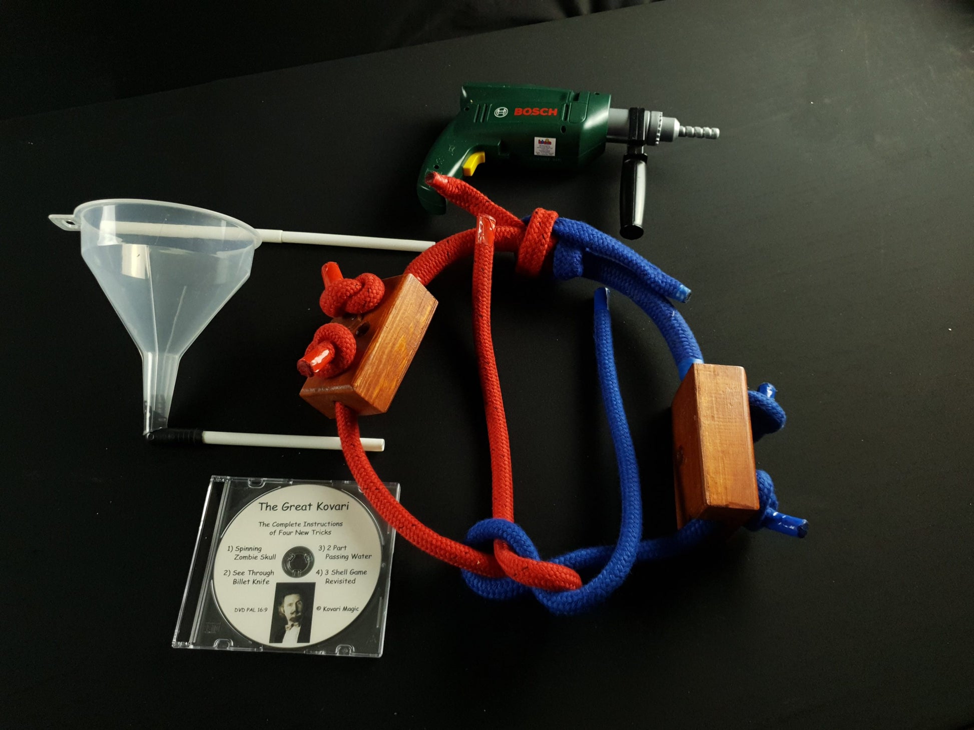 The performer then uses a toy drill and pretends to drill a hole right through the first volunteer. With one of the volunteers help, the performer proceeds to pour liquid into the funnel, it passes down through the block at the back, and by magic the liquid passes right through the volunteer and out of the front block! The front volunteer catches the liquid in a cup.