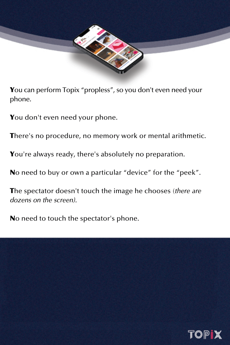 Most of the tricks used in Topix are new and have never been offered in magical applications.
